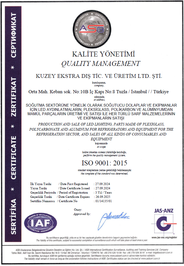 Founded in 2017, Kuzey Ekstra Dış Ticaret ve Üretim Ltd. Şti. provides advanced component solutions for industrial refrigerated cabinet manufacturers worldwide.